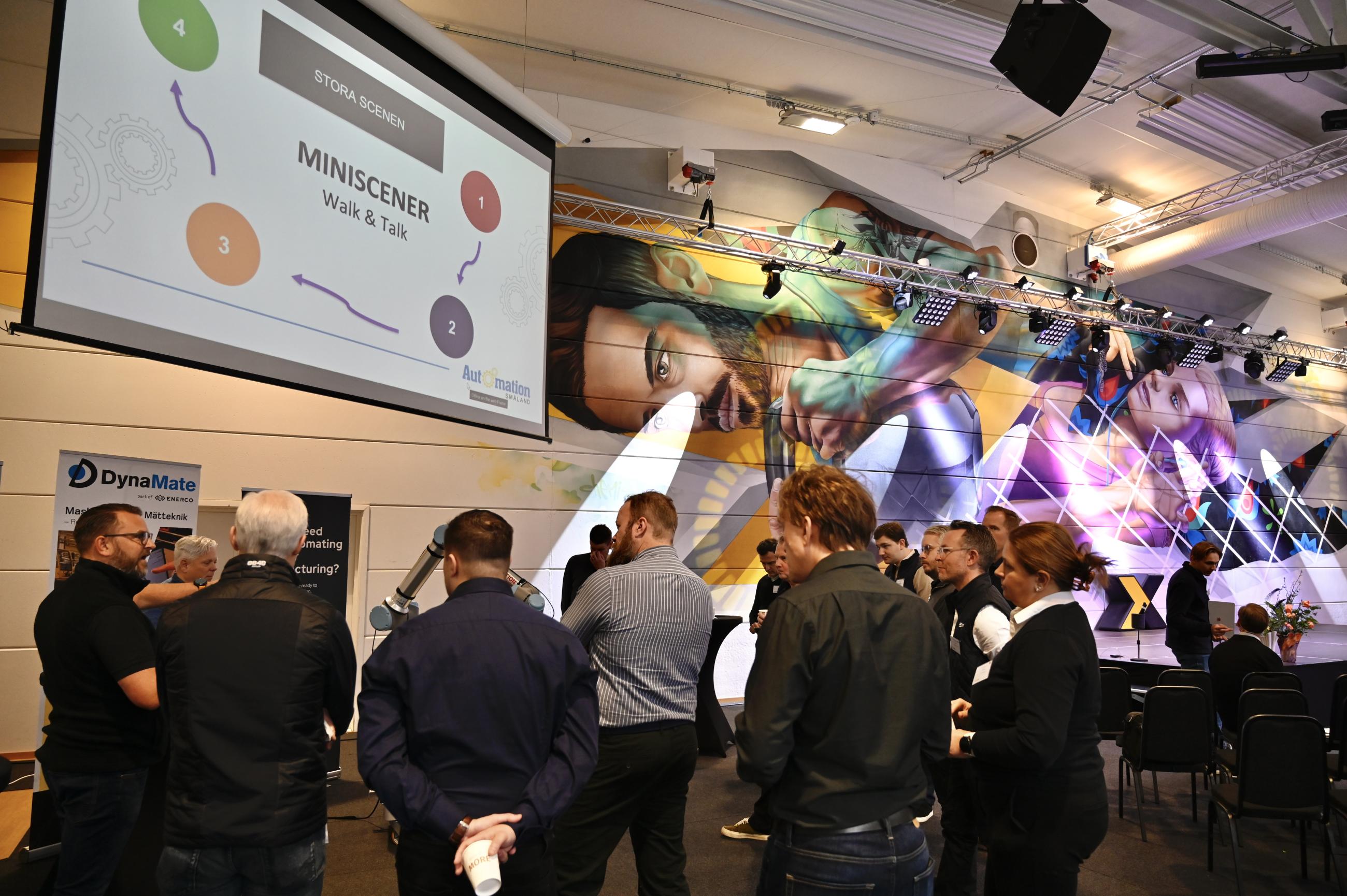 Eftermiddagen bjöd även på miniscener och livliga samtal i utställningen. I ett gemensamt pass, lett av Kerstin Johansen, professor vid Jönköping University, diskuterades hur Automation Småland konkret kan bidra till företagens utveckling. Tillsammans med Hossein Rahnama, forskare vid Luleå tekniska universitet, och Andreas Almqvist, teknisk säljare på SEW Eurodrive, belystes vikten av samverkan mellan akademi, leverantörer och tillverkande företag för att stärka både konkurrenskraft och omställningsförmåga.